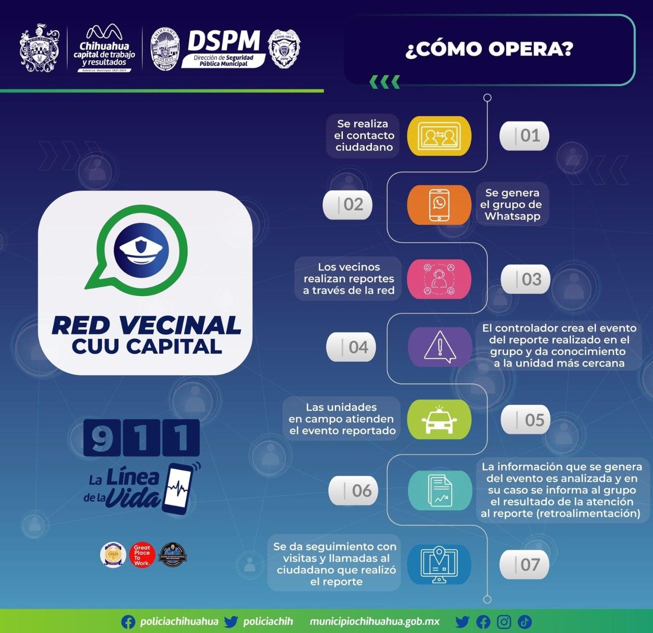 Esta red de comunicación fue implementada a finales del año pasado por parte del Gobierno Municipal y es atendida las 24 horas del día, directamente por personal de la DSPM en el centro de emergencias de la Comandancia Norte, al momento en que el mensaje llega mediante la red social.