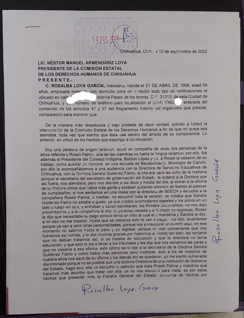 Estatal Rosalba Loya mujer Ralamuli fuí discriminada del SEECH siento tristeza, coraje, impotencia, estoy vulnerables e intranquila 3 min de lectura