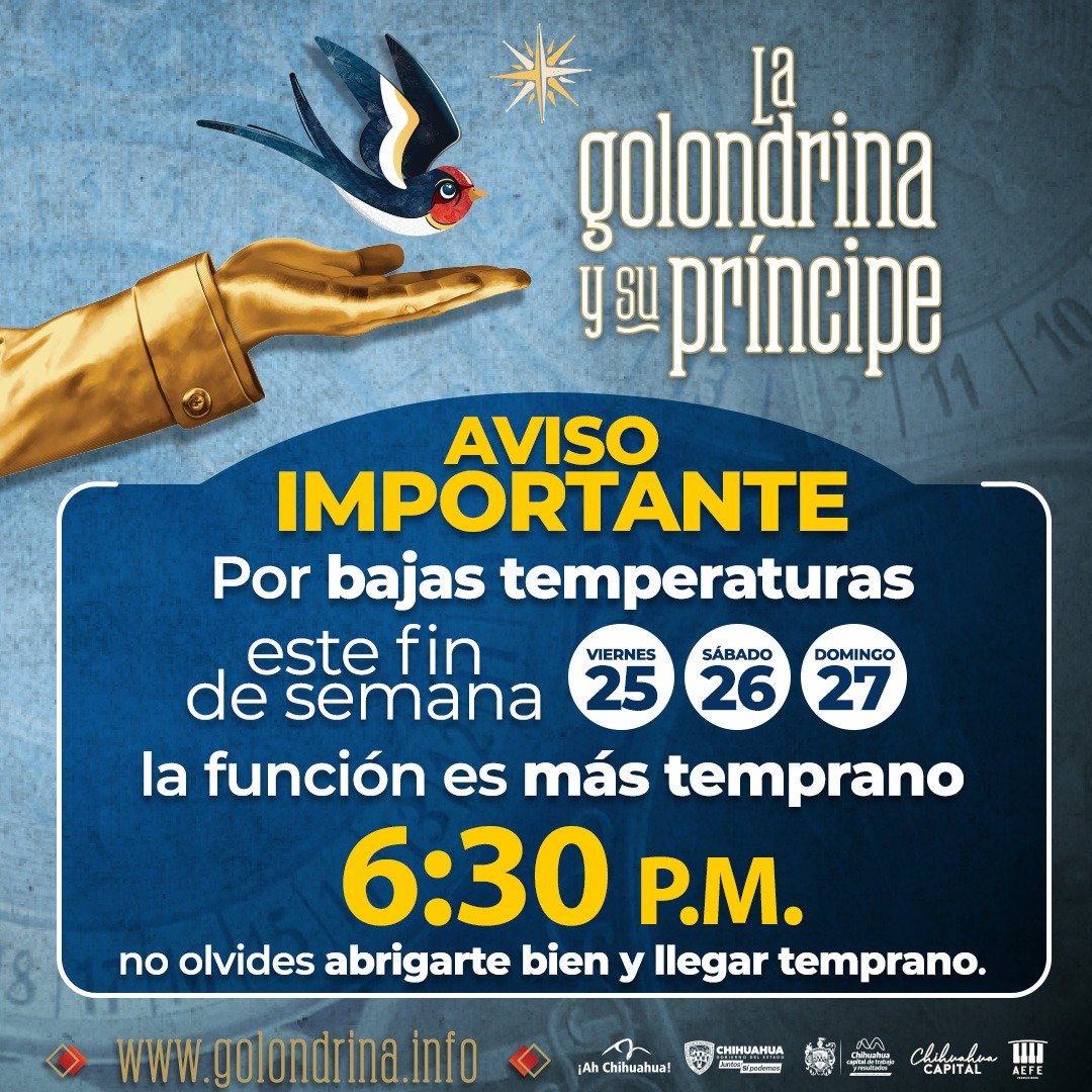Estatal Funciones del 25 al 27 noviembre de “La golondrina y su príncipe” serán a las 6:30 de la tarde 1 min de lectura