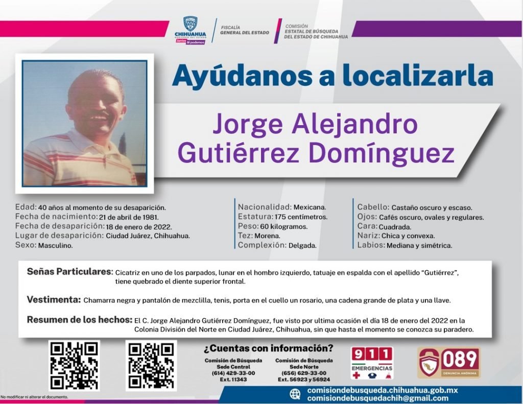 Estatal Efectúan labores de búsqueda de Jorge Alejandro Gutiérrez Domínguez en Ciudad Juárez 1 min de lectura
