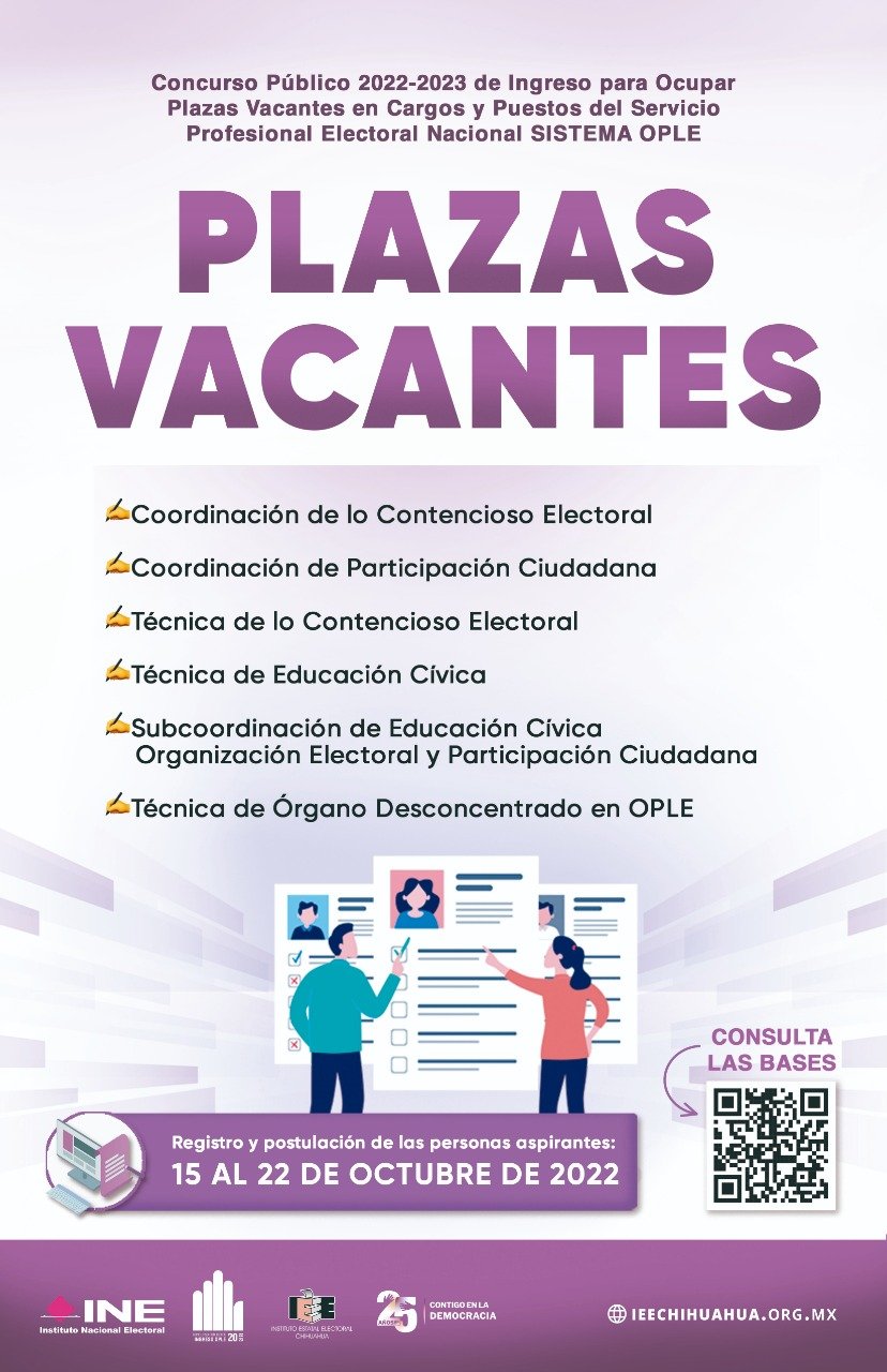 El INE México emitió convocatoria Concurso Público 2022–2023 de ingreso para ocupar plazas en los Organismos Públicos Locales Electorales, entre ellos el Instituto Estatal Electoral de Chihuahua (IEE).
