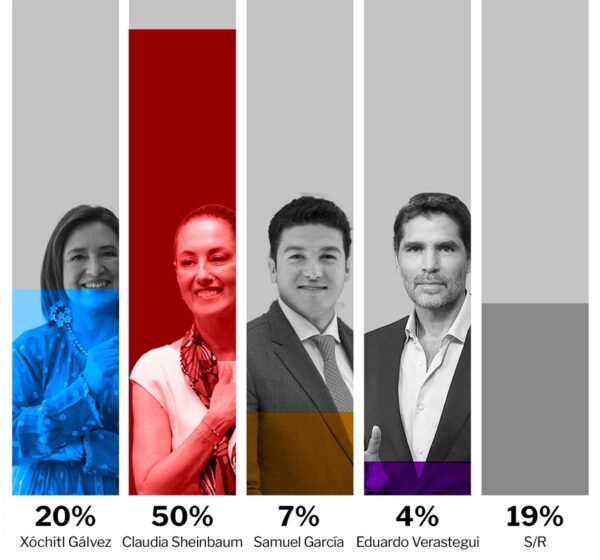 En cuanto a candidatos presidenciales, Sheinbaum se llevó la delantera con el 50%; Xóchitl Gálvez, obtuvo un 20%; Samuel García, un 7%; y Eduardo Verástegui, un 4 por ciento.