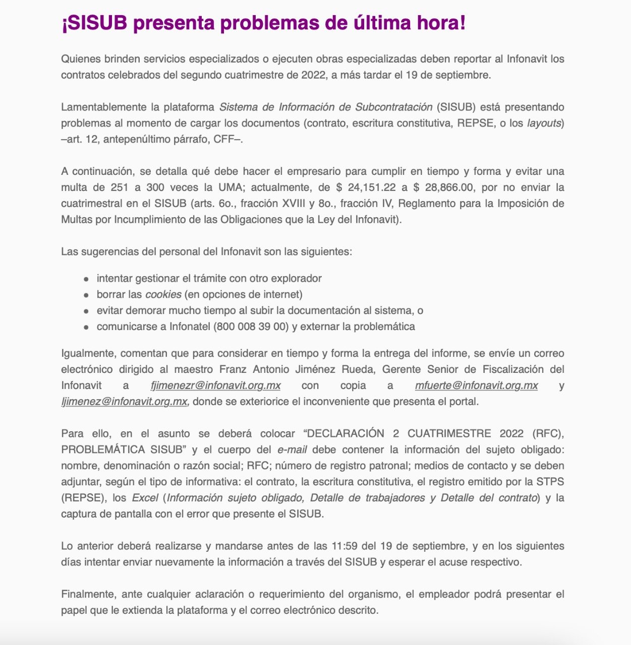 Para ello, en el asunto se deberá colocar “DECLARACIÓN 2 CUATRIMESTRE 2022 (RFC), PROBLEMÁTICA SISUB” y el cuerpo del e-mail debe contener la información del sujeto obligado: nombre, denominación o razón social; RFC; número de registro patronal; medios de contacto y se deben adjuntar, según el tipo de informativa: el contrato, la escritura constitutiva, el registro emitido por la STPS (REPSE), los Excel (Información sujeto obligado, Detalle de trabajadores y Detalle del contrato) y la captura de pantalla con el error que presente el SISUB.