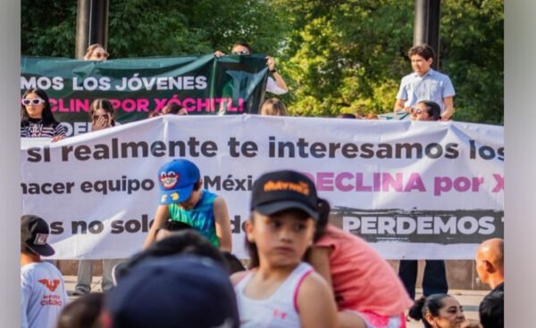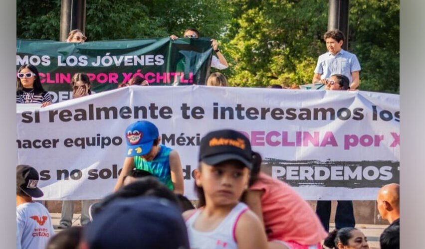 ´En Morelia, Michoacán, #XóvenesXingones interrumpieron el mitin del esquirol @AlvarezMaynez al grito de “no nos uses” y “ @XochitlGalvez es la opción, tú la división´. Le pedían declinar por Xóchitl con una lona que decía “si juegas, no solo pierdes tu, perdemos todo” escribió en la cuenta de X (antes Twitter) el grupo Xóvenes Xingones.
